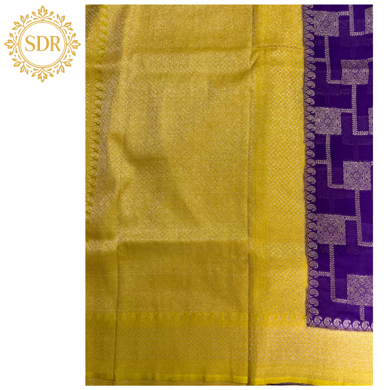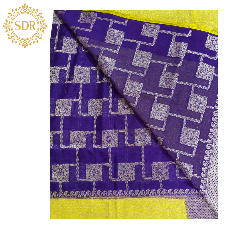Step into elegance with this stunning Banarasi Chiffon Georgette Saree in a rich Teal Blue hue, beautifully paired with a Contrast Purple Border. The saree features intricate zari weaving in traditional Banarasi motifs, blending heritage craftsmanship with a modern color palette. Its lightweight chiffon georgette fabric ensures a graceful drape with a soft, flowy texture — perfect for festive and formal occasions.