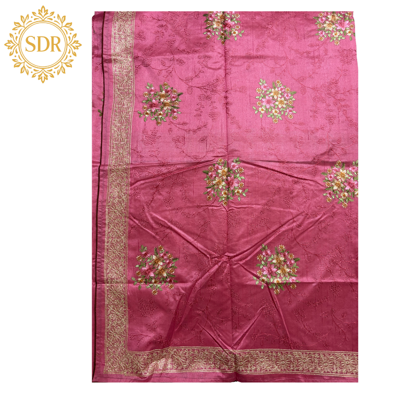 Embrace classic charm with this Pure Matka Silk Saree, crafted from premium-quality silk renowned for its natural texture and elegant drape. The saree showcases a soothing  onion pink or rani pink beautifully adorned with delicate multicolour floral thread embroidery, adding a touch of artistry and sophistication. silk blend with floral embroidery and a zari border.  enhances its refined appeal, making it an ideal choice for festive gatherings, traditional functions, and special occasions.