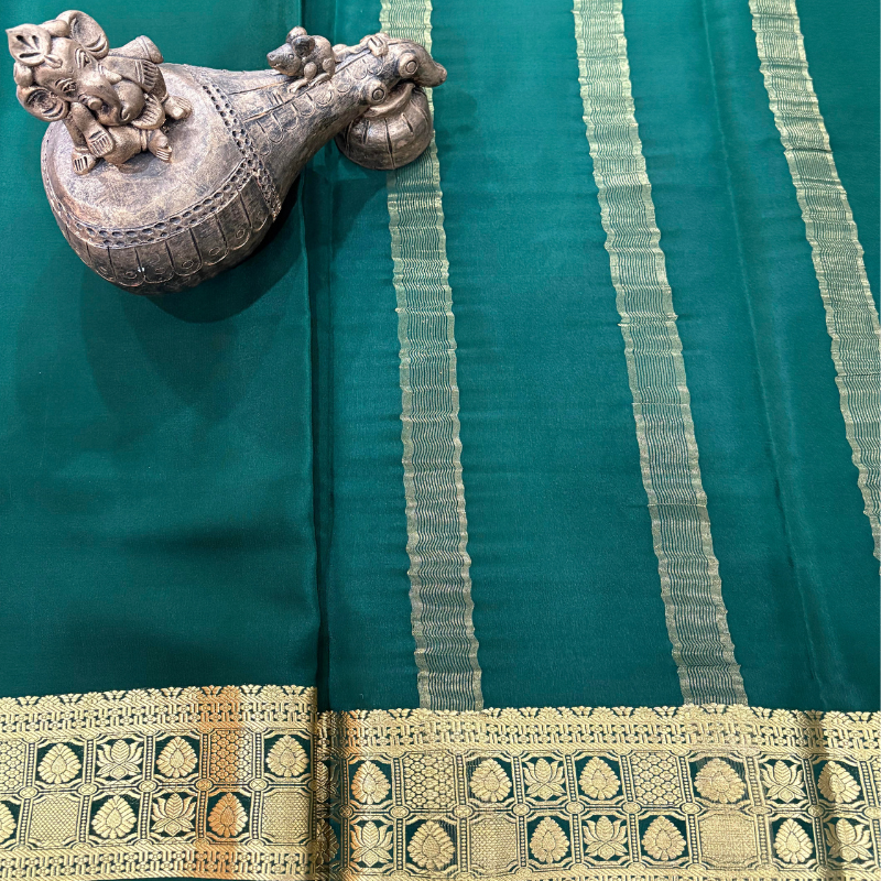 Experience timeless elegance with this stunning Pure Mysore Crepe Silk Saree, crafted with care and tradition. The BOTTLE GREEN fabric exudes sophistication, while the intricate golden zari border adds a touch of regal charm. This saree offers both comfort and grace, making it perfect for festive occasions, weddings, and special events.