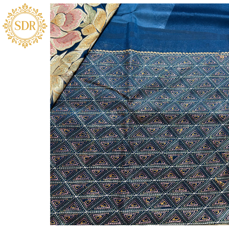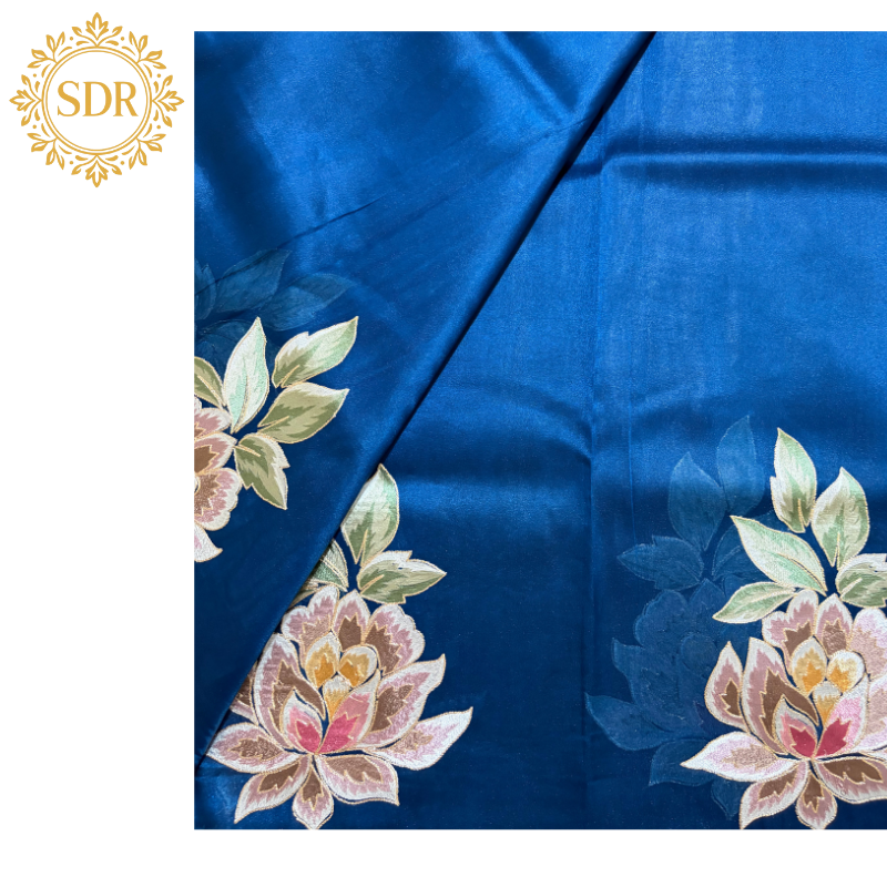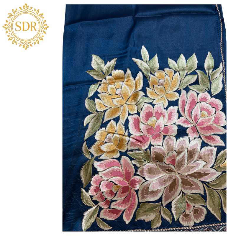 Colour:deep blue, with a floral pattern embroidered in multiple colors.