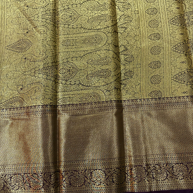 The rich contrasting border in deep purple with detailed golden zari work adds grandeur, making it perfect for festive occasions, weddings, and cultural celebrations.