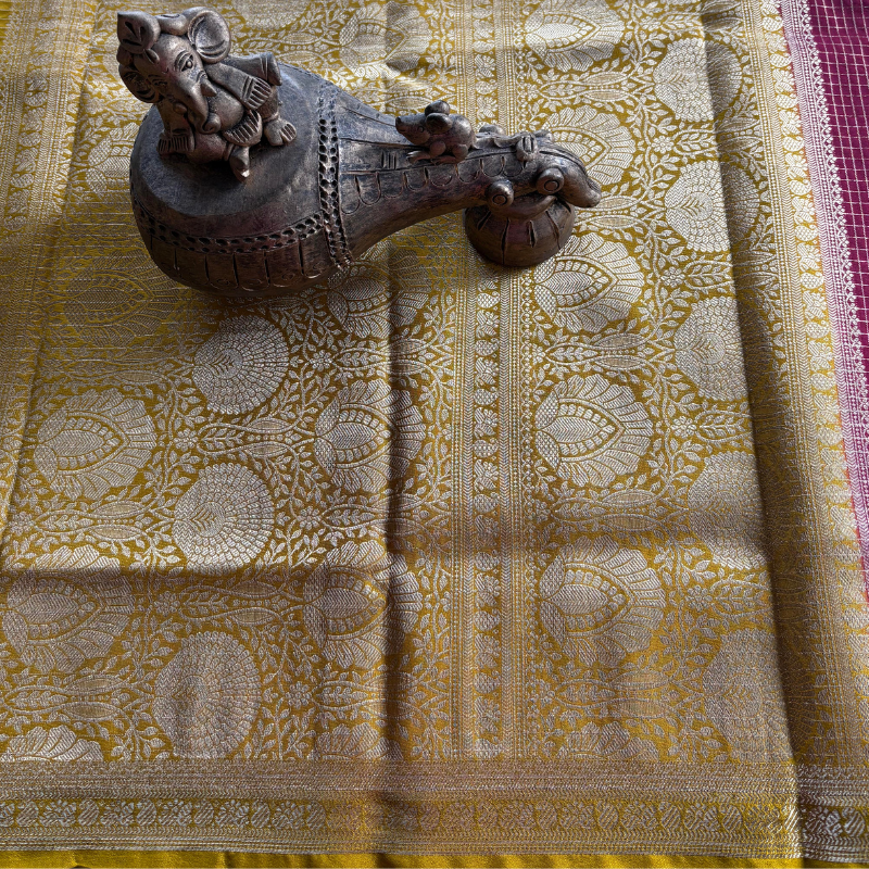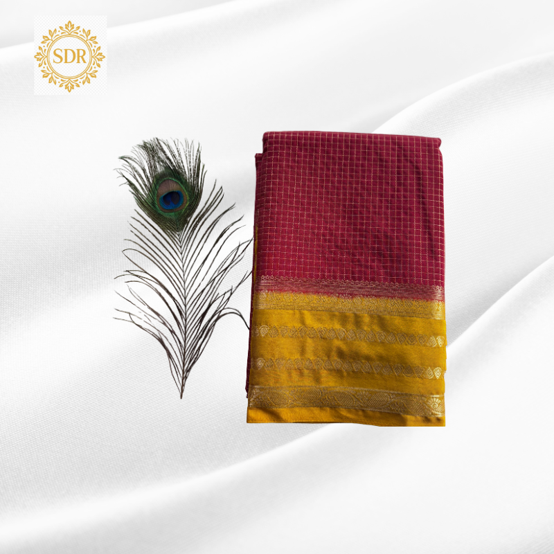 Drape yourself in timeless elegance with this Semi Mysore Crepe Silk Saree, crafted in premium quality fabric. The saree features a rich maroon body with golden checks, beautifully complemented by a mustard yellow zari border adorned with intricate traditional motifs. The luxurious crepe silk texture lends a graceful fall, ensuring both comfort and sophistication.