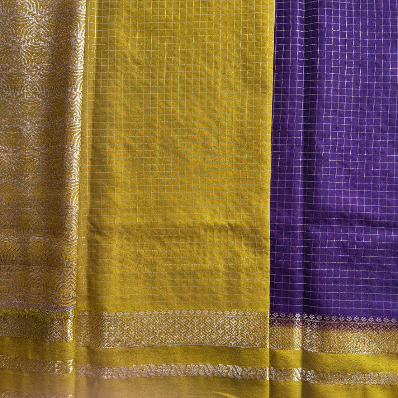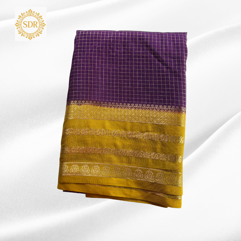 Drape yourself in timeless elegance with this Semi Mysore Crepe Silk Saree, crafted in premium quality fabric. The saree features a rich purple body with golden checks, beautifully complemented by a mustard yellow zari border adorned with intricate traditional motifs. The luxurious crepe silk texture lends a graceful fall, ensuring both comfort and sophistication.